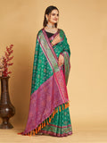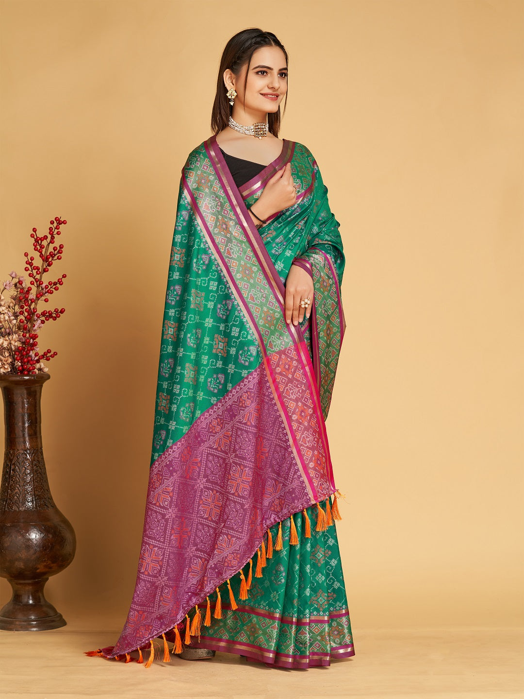 Make A Vibrant Statement With This Stunning Patola Saree Adorned With Intricate Geometric And Floral Motifs In Traditional Patterns. The Rich Emerald Base Is Beautifully Complemented By A Striking Pink And Pallu, Embellished With Golden Zari Detailing And Diamond-Shaped Designs That Exude Festive Charm. Crafted From Soft Silk Fabric, It Ensures A Graceful Drape With A Luxurious Feel. Ideal For Weddings, Festive Occasions, And Cultural Celebrations, This Saree Pairs Perfectly With Gold Jewellery For A Regal Ethnic Look.